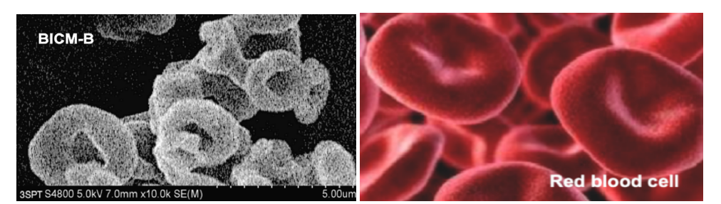 Figure 6:The high-resolution SEM image of BICM-B (the top) clearly shows that their morphology resembles the red blood cells (the bottom).