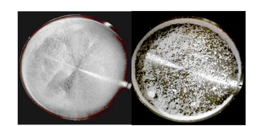 Figure 7:Comparison of aggregation behaviour of BICM-B vs Milled, there is no visible aggregation in BICM-B (left), while the crushed particles aggregate clearly visible in Milled (right).