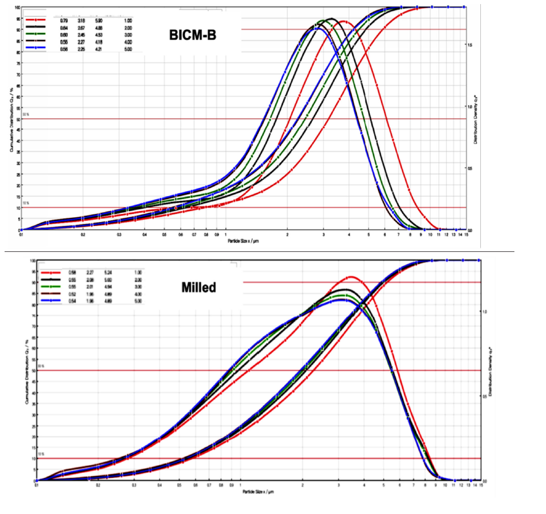 Figure 9:Comparison of the PTC of BICM-B vs Milled. When the dispersing pressure is sequentially increased from 1 to 5 bar, BICM-B shifted almost completely parallel towards smaller particle sizes by some distance. But, Milled, only the middle parts shift slightly towards smaller particle sizes, five curves almost entangled together.