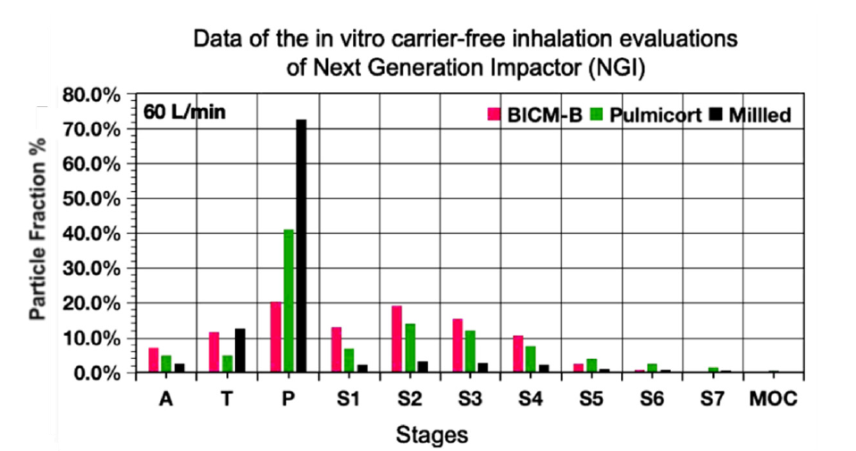 Figure 10:The most critical data for in vitro carrier-free inhalation evaluation by NGI, FPF<5μm, shows BICM-B at 32.9%, exceeding Pulmicortr® at 28.4%, where Milled shows FPF<5μm at 7.33% due to severe aggregation.