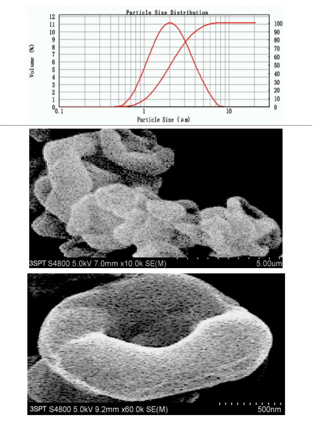 Figure 12:The PSD and high-resolution SEM images of BICM-BGF made by 3S-iSAS process. The top curve shows its PSD with nice normality of D10= 1.06μm D50= 2.06μm, D90= 4.09μm, and 85.6% of 1-5μm particles; the middle SEM showing that they resemble red blood cells; while the bottom SEM is a high magnification image, showing clearly the unique “nano-in-micro” structured bionic texture: the surface has dense felt-like nanowhiskers, and underneath it is a looming ring-like interwoven texture.