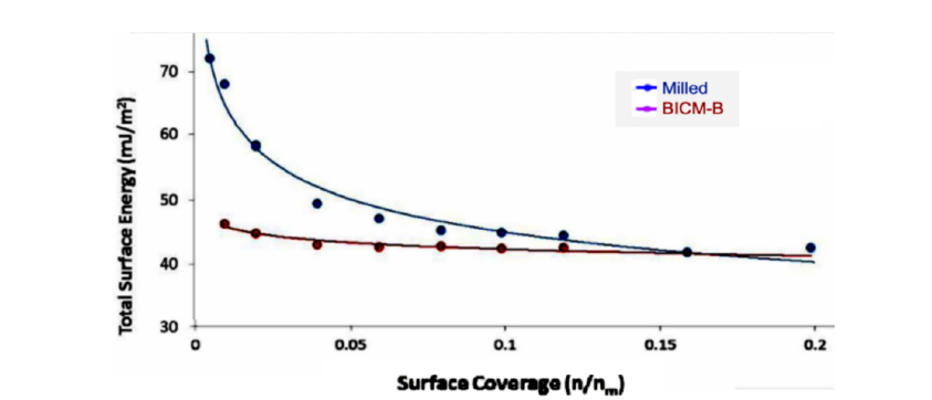 Using surface energy profile to evaluate inhaled powders is a new exploration in this study. This elevates the characterization of the multifaceted phenomena of inhaled powders to the level of physical roots. The surface energy profile of BICM-B is low and flat, resulting in minimal aggregation. In contrast, the surface energy profile of Milled is high and steep, leading to severe aggregation. It can indeed be said that a simple and intuitive surface energy profile distinguishes between the two eras of inhaled powders.