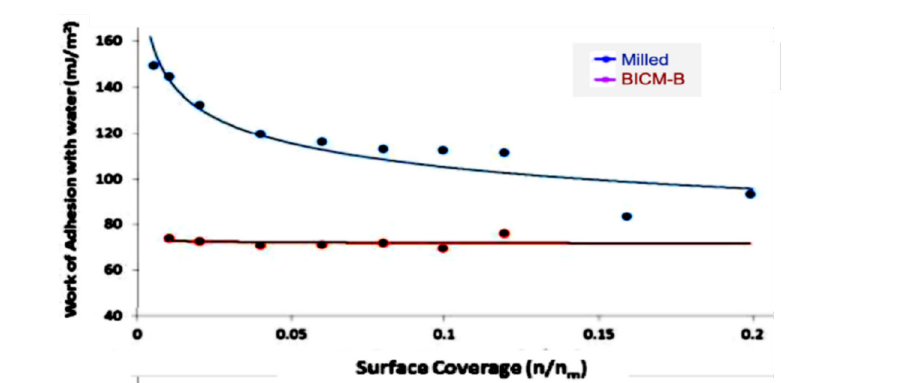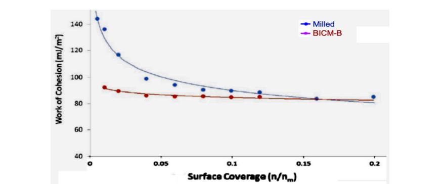 Figure 15:The comparison the cohesion work WW adh (WW adh as function of surface coverage) of BICM-B vs Milled, measured by IGC-SEA.