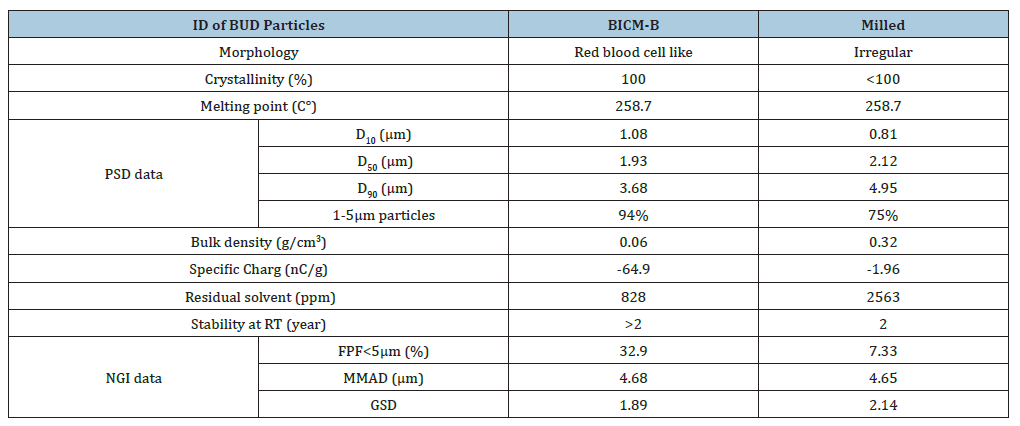 BICM-B is typical crystalline conformed by XRD patterns, the peak positions and relative intensities were consistent with API, indicated that there were no changes in crystal structure after 3S-iSAS process. the melting point is 258.7 °C confirmed by DSC analysis that is in a good agreement with API and the observation of Velaga et al. [32]. BICM-B’s physical properties are particularly significant in comparison with Milled (Table 1). Its Particle Size Distribution (PSD) is narrowly normal, with D10=1.08μm, D50=1.93μm, D90=3.68μm, and the proportion of 94% for particles between 1-5μm. Its bulk density is very low, at only 0.06g/cm³, close to the values reported in reference [33]. The residual solvent content is as low as 800ppm. The specific charge reaches -64.9nC/ g, which is beneficial for increasing the deposition rate in the lungs upon inhalation, as confirmed by studies using physical lung models [34], animal experiments [35], and research on human volunteers [36,37].