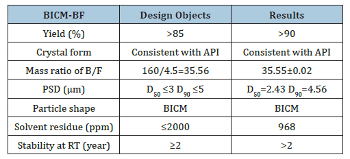 The successful trial production of BICM-BF is based on the experience of BICM-B. In the formulation of Symbicort®, the mass ratio of budesonide to formoterol is 80/4.5 or 160/4.5, which varies widely. Therefore, the development of BICM-BF faced two new challenges: (1) Can it be made into BICM-BF? (2) Can the product still maintain the mass ratio of the two drugs?