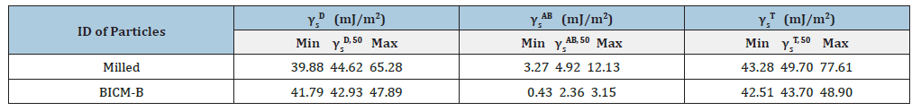 Let’s start by looking at the total surface energy profiles of BICM vs Milled, as shown in Figure 13, BICM’s is low and flat, which means that the particles of BICM-B are at almost the same energy level regardless of size and therefore are not prone to agglomeration; Milled’s is high and steep, which means that its energy level distribution is very different, with a natural tendency to move into a more stable low-energy state through agglomeration. In terms of the maximum value of the total surface energy (Table 3), BICM-B at 48.90mJ/m² and Mellied at 77.61mJ/m². This decrease of 28.71mJ/ m² in energy reflects various changes in the morphological and physical properties of BICM-B vs Milled, such as changes in surface morphology, increases in crystallinity, specific surface area, surface charge, toughness, dispersion, fluidity, and hydrophobicity, and decreases in bulk density, agglomeration, and friction, which are quantitatively characterized by the data in Table 1.