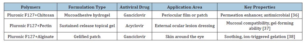 Polymers such as xanthan gum, alginate, pectin, and chitosan bring additional functional benefits, ranging from improved mucoadhesion and biocompatibility to enhanced rheological behavior and permeability. Their colloidal nature allows them to form stable networks that interact favorably with the epidermis, especially in sensitive regions like the eyelids and surrounding skin. When combined with synthetic agents like Pluronic F127, these natural polymers contribute to hybrid systems that are both structurally robust and biologically responsive. The synergy between synthetic and natural polymers is not merely a formulation choice; it is a therapeutic necessity. In periocular drug delivery, where precision, tolerability, and patient adherence are paramount, such combinations offer a balanced solution that meets clinical and practical demands. Looking ahead, the integration of multifunctional natural polymers into thermosensitive gels opens new avenues for personalized and sustainable treatments. These systems have the potential to redefine topical antiviral therapy, offering not only pharmacological efficacy but also enhanced patient experience and long-term safety.