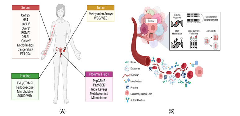 This Figure 1 above illustrates the landscape of ovarian cancer biomarkers and diagnostic modalities [14].(A) Categorizes detection methods into four domains Serum, Tumor, Imaging, and Proximal Fluids highlighting traditional biomarkers like CA-125, HE4, and CA 72-4 alongside newer platforms such as ROMA®, OVA1®, and CancerSEEK. (B) Depicts molecular and cellular components involved in tumor profiling, including circulating tumor DNA (ctDNA), exosomes, autoantibodies, and genomic alterations such as methylation and aneuploidy.