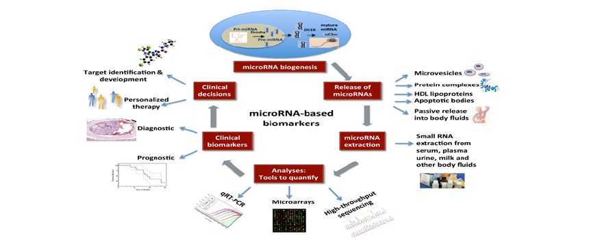 Short, non-coding RNAs known as microRNAs (miRNAs) control gene expression post-transcriptionally and are increasingly recognized for their role in ovarian cancer pathogenesis, including metastasis, apoptosis, proliferation, and chemoresistance. Their stability in body fluids such as blood, urine, and plasma makes them ideal candidates for non-invasive biomarker development. Figure 3 illustrates the complete miRNA biomarker pipeline, from biogenesis and extracellular release via exosomes and protein complexes, to extraction and quantification using qRT-PCR, microarrays, or sequencing. Clinically, miRNAs support diagnosis, prognosis, and personalized therapy, guiding treatment decisions and improving outcomes. For instance, miR-125b and miR-145 exhibit tumorsuppressive properties, while elevated levels of miR-200c, miR- 21, and miR-1290 correlate with poor prognosis [18]. Metaanalyses suggest that panels of circulating miRNAs outperform single markers, with some achieving sensitivity and specificity above 90% [19]. Recent studies employing machine-learning algorithms have further refined miRNA signature identification, enhancing predictive accuracy and facilitating clinical integration [20]. Nonetheless, challenges remain in standardizing detection platforms and validating findings across diverse populations.