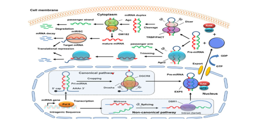 Figure 6:Biogenesis and functional pathways of microRNAs in cellular regulation. Source: López-Portugués et al. [23].