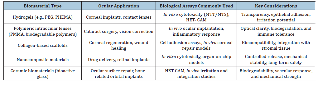 Biomaterials are materials designed to interface with biological systems to evaluate, treat, enhance, or replace tissues, organs, or physiological functions. According to Hoffman (2004), biomaterials can be classified into four major categories: polymers, metals, ceramics, and composites. Within this context, biological evaluation assays represent an essential tool during the development and characterization of these materials, principally for biocompatibility [1]. Biocompatibility does not only encompass the potential effects of biomaterials on the host organism, but also the reciprocal influence of the physiological environment on the material itself. Both natural and synthetic biomaterials exhibit intrinsic properties that determine their stability and compatibility. These characteristics must be thoroughly understood to predict the clinical performance of biomaterials such as ocular devices throughout their application period [1,2]. In the field of ophthalmology, the demand for safe and effective biomaterials has grown significantly, driven by applications such as intraocular lenses, corneal scaffolds, and contact lenses [3]. Biological evaluation assays are therefore indispensable tools in the development and characterization of ocular biomaterials. In vitro cytotoxicity tests, standardized by ISO 10993-5, represent the first step in screening materials for safety, while alternative models such as HET- CAM, sensitive in vitro protocols for ocular biocompatibility testing, highlight the importance of replacing traditional animal models with standardized assays capable of predicting acute irritation and phototoxicity, and tissueengineered corneal equivalents provide ethical and predictive approaches that reduce reliance on animal testing [4-6]. Ultimately, the integration of in vitro, alternative tests, and in vivo assays forms a comprehensive framework for advancing innovative biomaterials toward clinical translation in ophthalmology. The minireview aims to support future engineers and pharmaceutical scientists to drive in development of standardized in vitro testing protocols. By integrating biological assays with mechanical characterization, the optimization of biomaterials, including tissue scaffolds, polymeric implants, polymeric devices, and ceramics, can be achieved. This approach enhances the efficiency, quality, and safety of biomaterials in in vivo configurations for future biomedical applications.