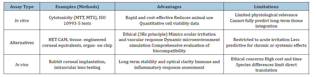 The evaluation of biomaterials for ocular applications requires a comprehensive framework that integrates in vitro, alternative, and in vivo assays. Cytotoxicity tests such as MTT and MTS provide essential insights into cell viability, while innovative approaches like HET-CAM, tissue-engineered corneal equivalents, and organon- chip models offer ethical and predictive alternatives to animal testing. Recent sensitive in vitro protocols employing reconstructed human cornea-like tissue (EpiOcularTM) have demonstrated the ability to reliably assess acute irritation and phototoxicity, expanding the applicability of ISO 10993-23 and OECD TG 498 guidelines. In parallel, microfluidic ocular-on-chip systems recreate dynamic physiological environments, enabling real-time evaluation of biomaterial interactions, drug release kinetics, and long-term tissue responses, thereby bridging the gap between laboratory assays and clinical translation [36-38]. Despite the indispensable role of in vivo studies in assessing long-term stability and optical performance, the future of ocular biomaterials lies in the development of smart, multifunctional materials capable of combining structural support with therapeutic delivery. By embracing advanced biological models such as EpiOcularTM protocols and ocular-on-chip platforms, alongside sustainable innovation, researchers can accelerate the translation of biomaterials into safe and effective ophthalmic devices, ultimately improving patient outcomes and reducing reliance on animal experimentation.