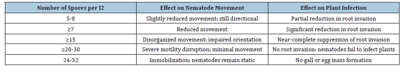 Table 1:Thresholds of Pasteuria penetrans spore attachment affecting nematode movement and plant infection.