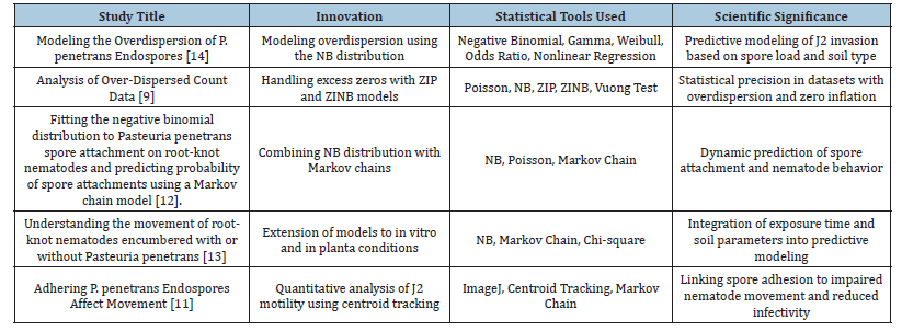 The following table (Table 2) presents a comparative summary of five key studies authored by Dr. Vagelas, each contributing uniquely to the understanding of P. penetrans as a biological control agent against root-knot nematodes (Meloidogyne spp.). These studies span over a decade and collectively demonstrate progressive advancements in statistical modeling, behavioral analysis, and biological validation. Each study introduces a unique methodological innovation, ranging from the modeling of over dispersed count data using negative binomial distributions to the simulation of nematode movement via Markov chain analysis and the in-planta validation of predictive thresholds. The implementation of zero-inflated models effectively addresses the challenge of excessive zeros in biological datasets. Additionally, image-based tracking and centroid analysis provide robust quantitative insights into nematode motility under spore encumbrance [9].