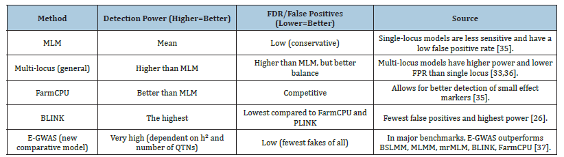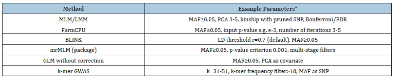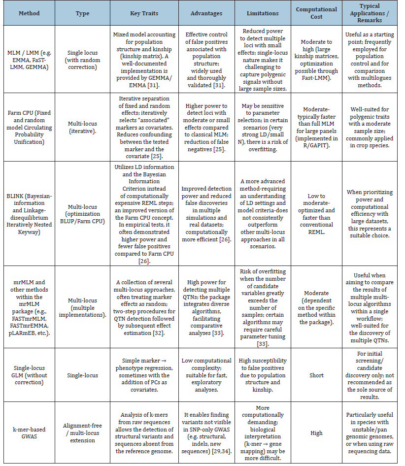 Traditional SNP-based GWAS are increasingly being complemented by k-mer-based approaches, which enable the detection of structural variants and sequences absent from the reference genome. This is particularly advantageous in species with complex genomes and high levels of diversity. Simultaneously, the integration of transcriptomic, methylomic, and functional data (multi-omics), along with the application of machine learning methods for feature selection and marker effect prediction, substantially enhances the power of detection and the biological interpretability of GWAS results [28-30]. The MLM/LMM framework remains the “gold standard” for population control and should be employed as a reference point-particularly in analyses where population structure is pronounced [31]. FarmCPU enhances detection power through the iterative partitioning of fixed and random effects, making it a robust solution for polygenic traits; however, it requires careful parameter tuning [25]. BLINK frequently outperforms FarmCPU in terms of statistical power and the number of true positives, while maintaining computational efficiency--thus, it represents a valuable option for large SNP panels (Table 1). The mrMLM approach, together with the suite of multilocus methods, is highly advantageous when the objective is to detect many QTNs; the integration of multiple algorithms further strengthens the validation of results [32,33].