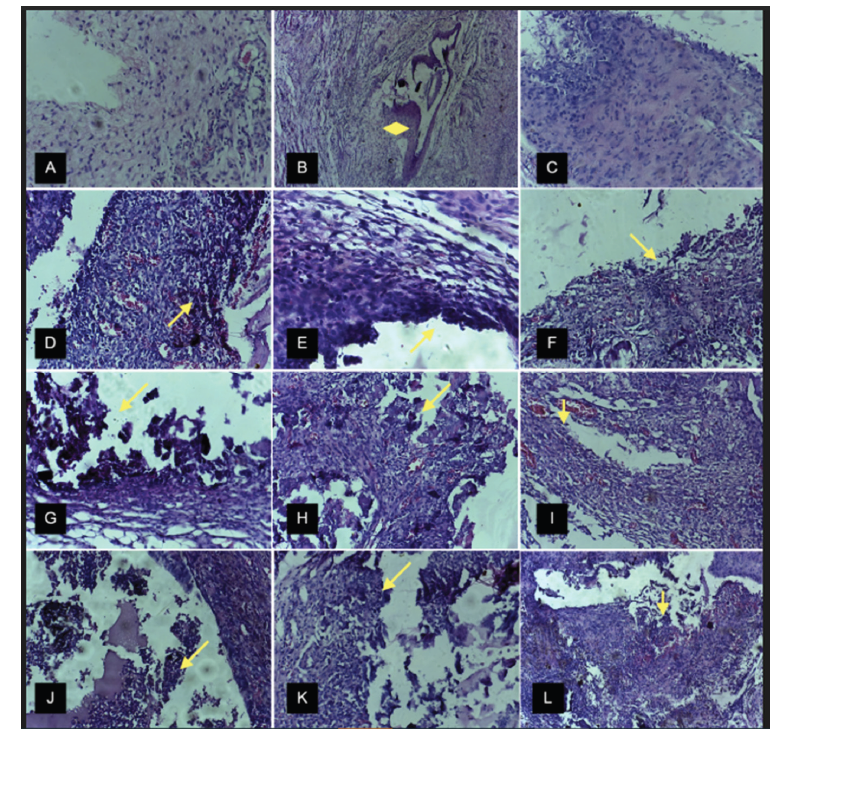 Figure 2:Description of histological sections: A (H&E, x40), B (H&E, x20) and C (H&E, x40)-connective tissue with the absence of an inflammatory process in NC group (negative control) at 7, 14 and 30 days, respectively; In B can be noticed the proliferation of connective tissue toward the inner part of the tube (diamond). D (H&E, x40), E (H&E, x40) and F (H&E, x40)-connective tissue with an inflammatory process (arrow) in PC group (positive control) at 7, 14 and 30 days, respectively. G (H&E, x40), H (H&E, x40) and I (H&E, x40)-connective tissue with the presence of an inflammatory process (arrow) in CH/Aloe gel (experimental medication 1) group at 7, 14 and 30 days, respectively; In I can be observed the mild inflammatory process. J (H&E, x40), K (H&E, x40) and L (H&E, x20)-connective tissue with an inflammatory process (arrow) in CH/Aloe power (experimental medication 2) at 7, 14 and 30 days, respectively.