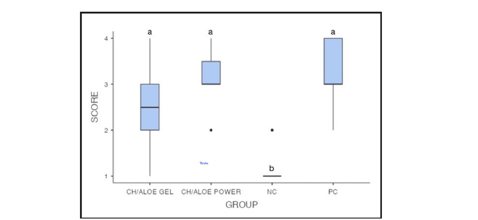 Figure 1:Box plot to scores of the inflammatory process to each experimental group. CH/Aloe gel group, CH/ Aloe gel power group, NC group and PC group represent experimental medication 1, experimental medication 2, negative control and positive control, respectively. The scores describe the intensity of the inflammatory process: score 1=non-significant; score 2=mild; score 3=moderate; and score 4=severe. Different letters express statistically significant differences among groups (Kruskal-Wallis at p<0.001 and Dwass-Steel-Critchlow-Fligner pairwise comparisons).