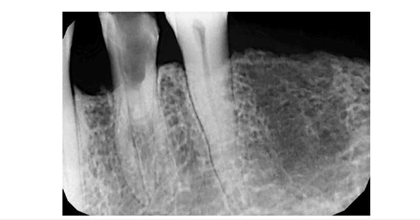 Figure 1:Pre-operative radiograph of mandibular left first premolar (tooth #34) showing a radiolucency involving enamel, dentin and pulp suggestive of extensive cavity preparation done. The root morphology of the tooth was indicative of presence of multiple roots.
