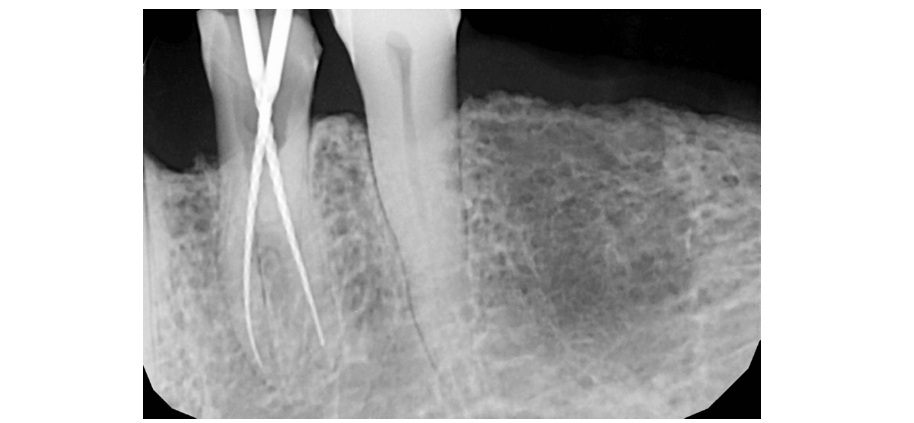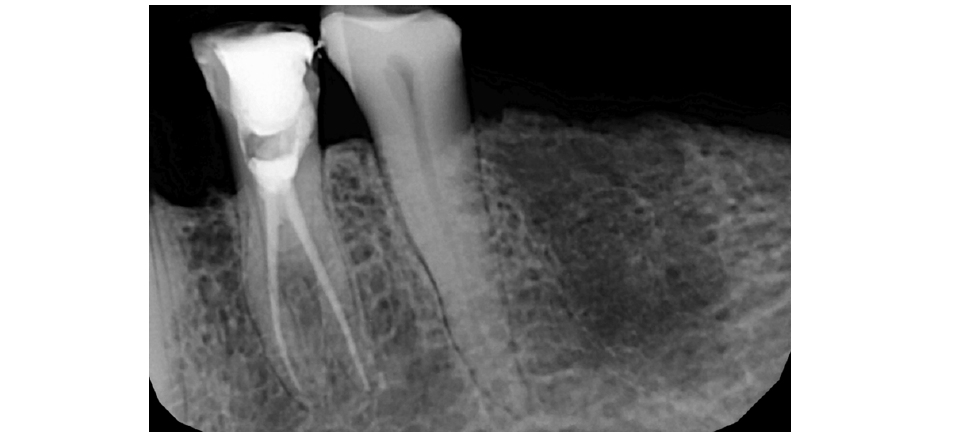 Figure 3:Post-operative radiograph of mandibular left first premolar (tooth #34) following obturation of 2 separate root canals.
