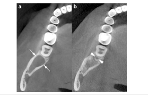 Figure 10:Serial follow-up images of the same NBCCS patient shown in Figure. a) An axial CBCT scan reveals the development of a new lesion in the right mandibular third-molar region (arrows), which was subsequently removed surgically. b) A postoperative axial CBCT scan obtained one year later shows a very small recurrence at the previous surgical site (arrowheads).