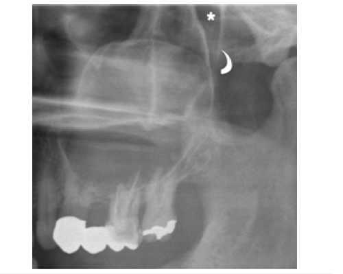 A cropped panoramic radiograph of the posterior left maxilla shows a large OKC extending into the maxillary sinus (arrows). The posterior wall of the maxillary sinus (curved arrow) and the pterygopalatine fossa (asterisk) are also visible. Radiographically, OKCs may cause tooth displacement and, less commonly, root resorption. Root resorption is considered an uncommon feature, with reported incidences ranging from 1.3% to 11% [9]. The literature indicates that cortical bone perforation is not unusual in OKCs, with intraoperative reports ranging from 39% to 51% [9]. However, this feature is rarely detectable on panoramic radiography and when present, is generally confined to the alveolar crest.