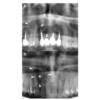 A cropped panoramic radiograph reveals a large OKC with well-defined, lobulated borders (arrowheads) occupying the mandibular body. An incomplete internal septum is also visible within the lesion (opposing arrows). Approximately 30% of OKCs are associated with at least one unerupted tooth-most commonly the third molars [9]. This association is observed more frequently in younger patients [15]. The radiographic characteristics of OKCs are not pathognomonic, especially in small unilocular lesions [15]. When a small unilocular OKC appears in the anterior maxillary sextant, it may mimic other odontogenic or non-odontogenic cysts, such as radicular cysts (Figure 1), lateral periodontal cysts or nasopalatine duct cysts [17]. Histologically confirmed OKCs. Cropped panoramic radiographs (a and b) demonstrate two unilocular radiolucent lesions (asterisks) with well-defined, corticated borders (arrowheads) located in the anterior maxilla between the roots of adjacent teeth. The radiographic appearance of these radiolucencies may mimic a radicular cyst. Large mandibular OKCs characteristically grow along the length of the mandible, showing minimal Bucco-lingual expansion, particularly within the mandibular body [15]. On panoramic radiography, this growth pattern typically presents as an extensive radiolucent lesion with significant mesiodistal extension and little or no cortical expansion (Figure 1 & 2). In contrast, large maxillary OKCs often produce marked expansion of the alveolar bone and may involve adjacent anatomical structures. Notably, when a maxillary OKC originates in the molar region, extension into the maxillary sinus is commonly observed (Figure 2) [22].