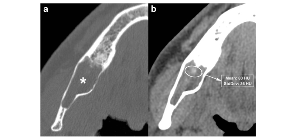 Figure 8:Axial MDCT image with bone window (a) shows an OKC in the posterior region of the right mandible (asterisk). Axial MDCT image with soft tissue window (b) clearly demonstrates a high-density area within the lesion (elliptical ROI), with a mean attenuation value of 80 HU.