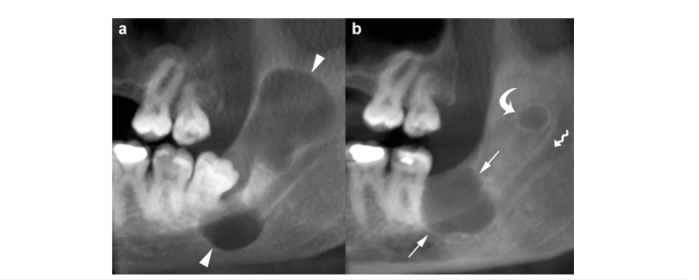 Despite these clues, OKCs can resemble other odontogenic lesions depending on their presentation. When associated with an impacted tooth, they may mimic a dentigerous cyst (Figure 9a). Multilocular OKCs located in the posterior mandible or ramus can resemble an ameloblastoma, while those in a periapical position or an edentulous area may simulate a radicular cyst. Consequently, dentigerous cysts, ameloblastomas, and radicular cysts remain the most frequent entities considered in the differential diagnosis of OKCs.