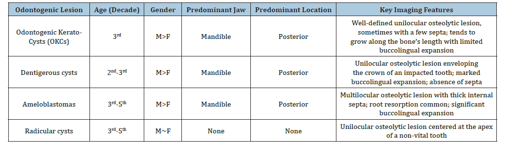 Table 1:Overview of typical characteristics of Odontogenic Kerato-Cysts (OKCs), dentigerous cysts, ameloblastomas and radicular cysts.