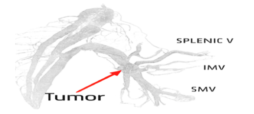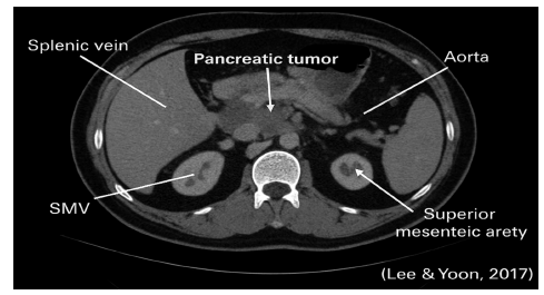 Figure 3:A mass in the pancreatic head compressing nearby vessels revealed by a CT imaging. Source: Lee and Yoon [15].
