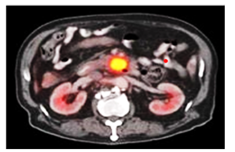 Positron Emission Tomography–CT (PET-CT) detects metabolic activity using 18F-FDG, identifying malignant lesions before structural changes are visible. It is particularly useful for staging and detecting distant metastases [4]. Axial PET/CT scan demonstrating a hypermetabolic lesion in the pancreatic region in Figure 5 below, consistent with suspected pancreatic adenocarcinoma. The lesion exhibits intense 18F-FDG uptake, indicative of elevated metabolic activity. Bilateral kidneys are visualized with physiologic tracer excretion. A smaller adjacent focus suggests possible regional lymphatic involvement. These findings support further diagnostic evaluation via endoscopic ultrasound and tissue biopsy.