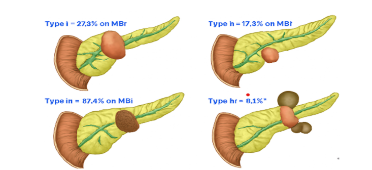 The imaging classification of pancreatic ductal adenocarcinoma (PDAC) with histological large duct pattern is divided into four types based on MRI features and ductal morphology. Type I (27.3%) shows a well-defined, round lesion near the pancreatic head, indicating localized ductal expansion with minimal invasion (Lee et al., 2024). Type II (17.3%) presents a smaller lesion in the body of the pancreas, reflecting early ductal changes with subtle imaging findings (Lee et al., 2024). Type III (87.4%) the most common displays a large, irregular mass in the pancreatic body, consistent with extensive ductal involvement and aggressive pathology (Lee et al., 2024). Type IV (8.1%) features multifocal lesions in the body and tail, suggesting diffuse ductal transformation and possible multicentric origin (Lee et al., 2024).