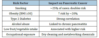 Pancreatic cancer is multifactorial, with both genetic predispositions and environmental exposures playing critical roles. Approximately 10% of cases are attributed to hereditary factors, including mutations in genes such as BRCA1, BRCA2, PALB2, ATM, and CDKN2A [8]. Individuals with these mutations often have a significantly elevated lifetime risk, particularly when combined with a family history of pancreatic or related cancers. As summarized in Table 2 lifestyle factors also contribute substantially to disease risk. Cigarette smoking is one of the most well-established modifiable risk factors, accounting for nearly 25% of pancreatic cancer cases and doubling the risk compared to non-smokers [9]. Obesity, particularly with a body mass index (BMI) over 30, has been linked to a 20% increase in risk, while chronic alcohol consumption and type 2 diabetes are associated with both direct and indirect pathways of carcinogenesis [6]. Diets low in fruits and vegetables and high in processed meats may further exacerbate risk, though evidence remains mixed. Environmental exposures, such as prolonged contact with industrial chemicals used in dry cleaning and metalworking, have also been implicated. These exposures may induce chronic inflammation or DNA damage, contributing to malignant transformation in pancreatic tissue [9].