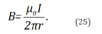 The magnetic induction vector B, defined by equation (22), is directly related to the movement of the current carriers, and thus to the intensity of the flowing current I . For the considered model, B is: