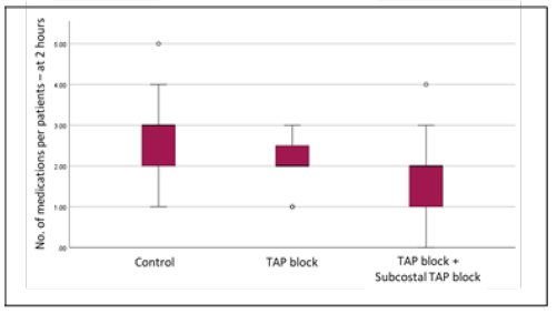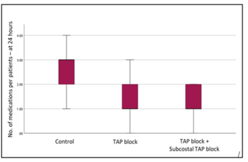 Post Hoc Tests revealed that at 2 hours there was a significant difference in the mean number of medications used by the control group vs. the TAP+Subcostal TAP treatment group (Pv=0.003) and 24 hours after surgery there were significant differences in the mean number of medications used by the control group vs. the TAP as well as TAP+Subcostal TAP treatment groups (Pv<0.001 for both comparisons). There was not a statistical difference between the treatments arms (Pv=0.722 at 2 hours after surgery and Pv=0.906 after 24 hours after surgery). These findings are also presented in box-plot comparison in Figure 1a & 1b (Kruskal-Wallis tests)