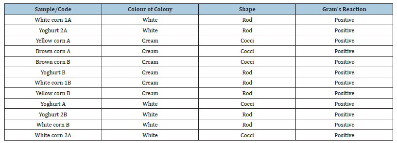 Morphological description of LAB isolates from Ogi and yoghurt samples is presented in Table 1 and Figures 1-8. Colony colour was either white or cream, varying from one sample to another. Rods and cocci were identified from cell shape analysis, while Gram staining proved that they were all Gram-positive.
