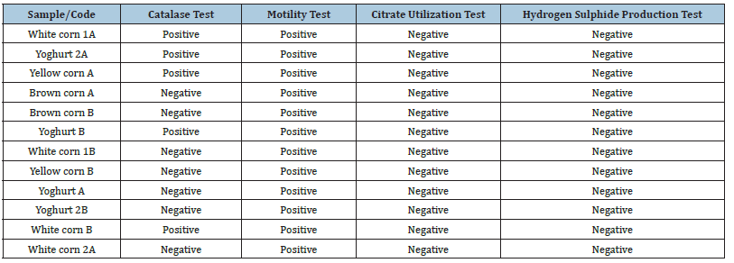 The biochemical test results for Lactic Acid Bacteria (LAB) isolates of yoghurt and Ogi samples are summarized in Table 2 and Figures 9-12. Isolates varied in catalase test; some were catalasepositive (White corn 1A, Yoghurt 2A, Yellow corn A, Yoghurt B, White corn B), while others were catalase-negative. However, all the isolates were motile, indicating a persistent ability to move. All the isolates failed to grow on citrate as a source of carbon and were negative for hydrogen sulphide production. The catalasenegative dominance is consistent with the expected characteristics of LAB, which are usually catalase-negative due to the absence of cytochromes [17]. Catalase-positive reaction in some isolates may be attributed to the manifestation of pseudo-catalase activity, as seen in some described instances of Lactobacillus and Leuconostoc species [3,18]. The motility of all the isolates suggests that these isolates can include species whose mobility is flagella-mediated and therefore may help in substrate colonization [19]. The inability of the isolates to ferment citrate and emit hydrogen sulphide both further their identification as LAB, since such organisms do not typically harbor enzymatic equipment for such metabolisms [20]. These biochemical patterns coupled with sugar fermentation patterns confirm the isolates’ conformities to typical LAB characteristics, further pointing to their promise as safe and viable microorganisms for food fermentation [3].