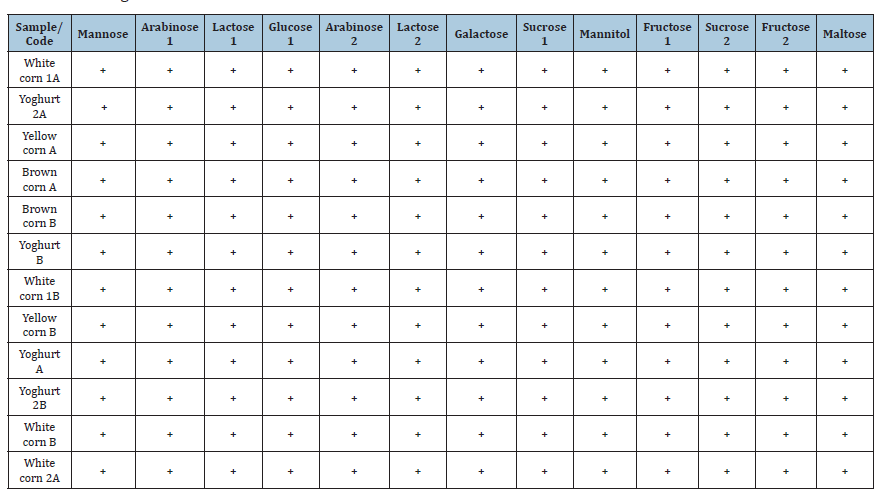 Sugar fermentation test revealed that all the LAB isolates obtained from Ogi (white corn, yellow corn, brown corn) and yoghurt samples possessed a general ability to ferment a broad range of sugars such as mannose, arabinose, lactose, glucose, galactose, sucrose, mannitol, fructose and maltose (Table 3). Each of the isolates gave a positive result (+) for all the tested carbohydrates and none of the results were negative. Such a uniform pattern of sugar utilization across the isolates indicates extensive fermentative capacity and strong enzymic potential [21]. Such metabolic adaptability is a characteristic feature of LAB, which are known to harness different monosaccharides and disaccharides effectively by glycolytic and related pathways with lactic acid as the major end product [22]. General hexose fermentation of glucose, fructose and galactose was expected as they are central molecules in energy metabolism, while the ability to ferment lactose, maltose and sucrose demonstrates the uniqueness of the isolates in feeding on both cereal-substrate (Ogi) and milk-substrate (yoghurt) [23]. The similarity of the fermentative pattern between Ogi-derived and yoghurt-derived isolates reflects that LAB obtained from indigenous cereal fermentations in their traditional environments possess the same technological qualities as the applied strains during dairy fermentations [17]. This substantiates previous findings that indigenous Lactobacillus, Leuconostoc and Pediococcus genera are capable of fermenting a broad spectrum of sugars and thereby enhancing their functional potential in food products [24]. Their ability to metabolize mixed carbohydrates indicates that they are suitable as potential starter cultures for yoghurt manufacture, with the capacity to enhance product stability, quality and nutritional value [16]. As yoghurt starter cultures, Ogi-derived LAB demonstrate technological characteristics comparable to those of industrial dairy starter cultures [25]. In addition, the use of Ogi LAB may be particularly relevant for modulating gram-negative bacteria that release lipopolysaccharides (LPS) [25]. Consequently, incorporating Ogi LAB as a yoghurt starter culture may contribute to reducing plasma LPS levels in individuals with various chronic diseases [26]. The ability of the whole isolates to ferment a wide range of sugars suggests that lactic acid bacteria from Ogi and yoghurt are metabolically heterogeneous and endowed with powerful enzymatic machinery for carbohydrate utilization. This is consistent with the earlier findings on lactic acid bacteria, in which Lactobacillus, Leuconostoc, Pediococcus and Streptococcus species were recorded as efficient mono-and disaccharide fermenters [27].