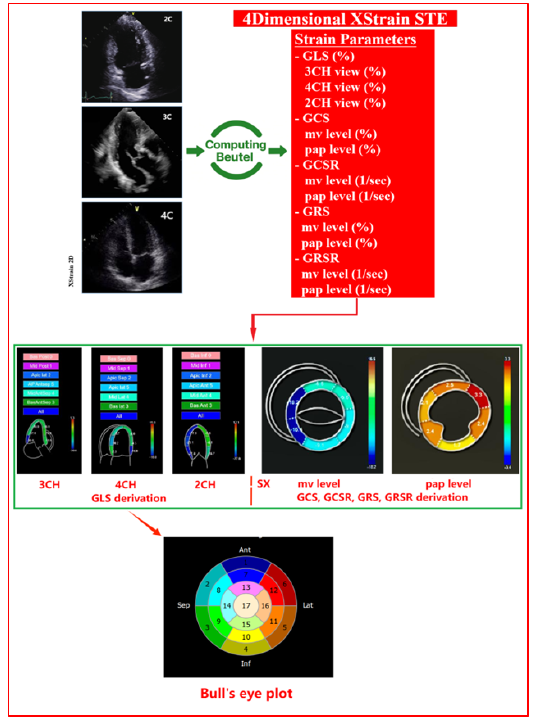 Currently, Global Longitudinal Strain (GLS) assessment via two-dimensional Speckle Tracking Echocardiography (2D STE) remains one of the most extensively investigated techniques worldwide [1]. The American Society of Echocardiography recommends a normal GLS value of > -20±2% [2]. Three-dimensional Speckle Tracking Echocardiography (3D STE) enables single-apical acquisition of the left ventricle, thereby reducing acquisition time and allowing a comprehensive evaluation of strain parameters [3]. However, its clinical application is constrained by suboptimal temporal and spatial resolution, which can impair tracking accuracy. In addition, multi-beat acquisitions may introduce stitching artifacts between subvolumes, further compromising speckle tracking analysis [4,5]. 4DXStrainSTE is an innovative and advanced imaging modality that integrates Tomtec GMBH’s 3D/4D imaging platform with Beutel™ computational technology [6]. It synthesizes STE data from apical 3CH, 4CH, and 2CH views to achieve a comprehensive three-dimensional reconstruction of Left Ventricular (LV) strain parameters. By capitalizing on the superior temporal and spatial resolution of 2D imaging, this technique effectively mitigates the inherent limitations of full-volume 3D STE [7]. While single-plane 3D echocardiography still suffers from lower resolution compared to 2D imaging [8], 4DXStrainSTE overcomes these constraints and offers an accessible, cost-efficient, and userfriendly solution for LV strain analysis.