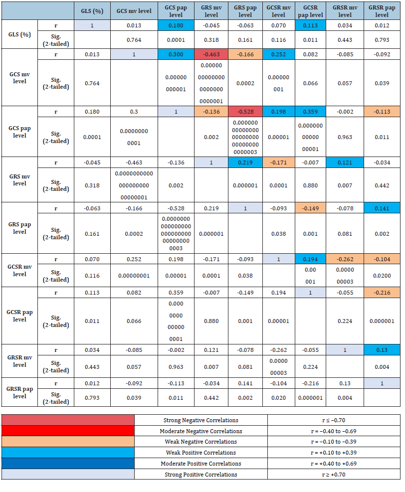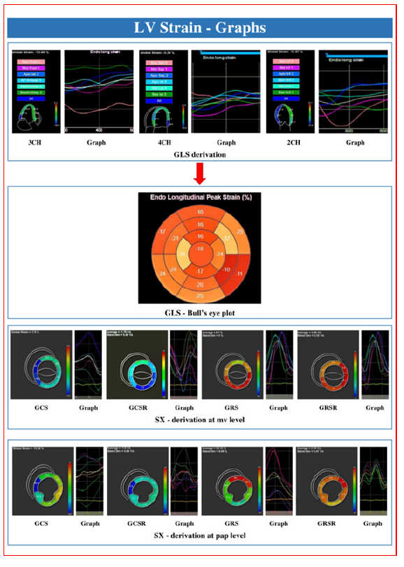 GLS and GCS are expressed as negative values, whereas GRS is represented as positive values. Similarly, strain and strain rate are denoted in % and 1/sec, respectively (Figures 2&3).