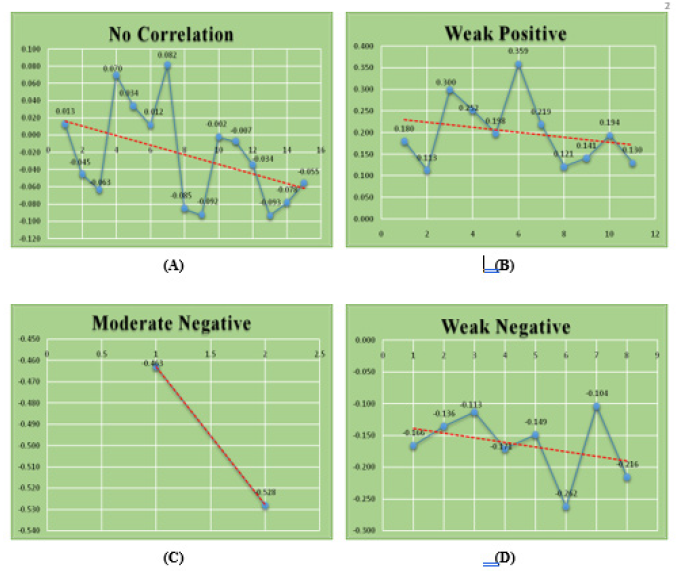 Figure 5:Pearson’s correlation: (A), No correlation; (B), Weak Positive; (C), Moderate Negative; (D), Weak Negative.