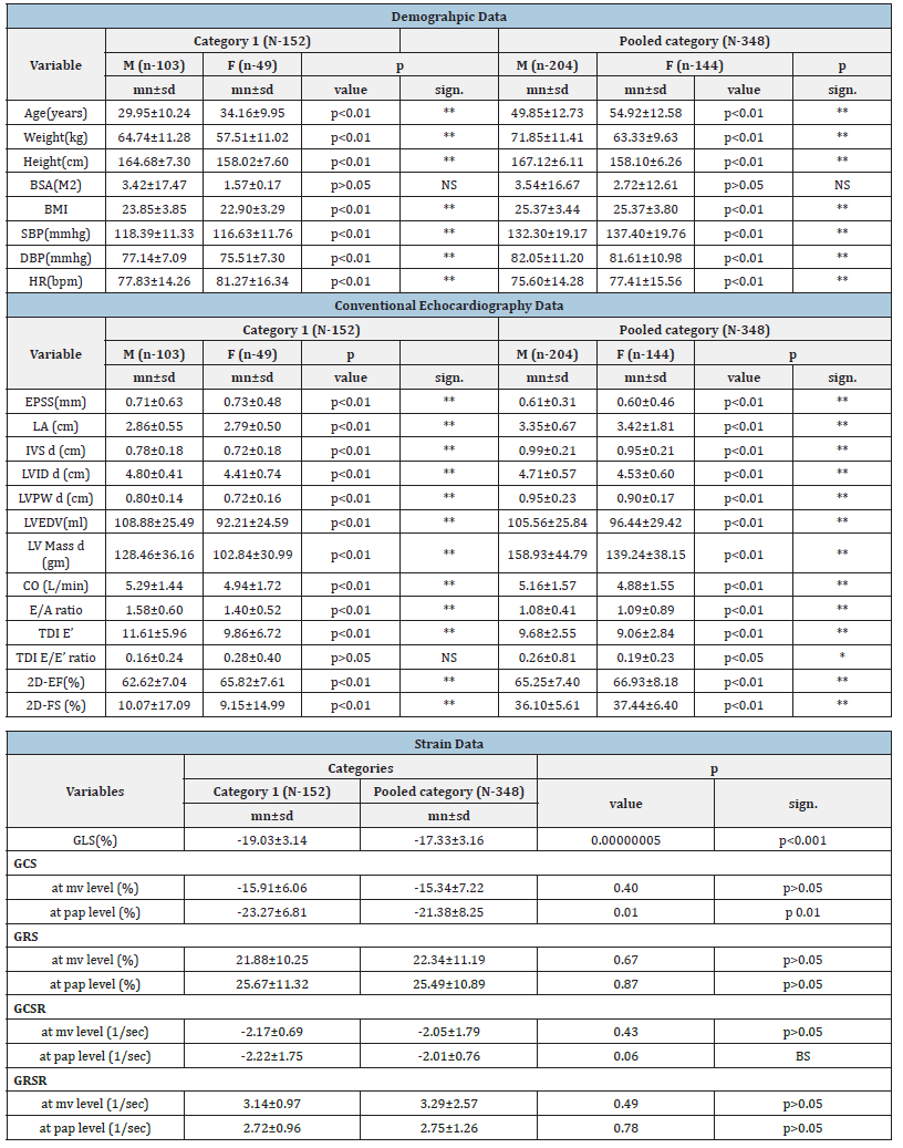 Sd: Standard deviation; sign: Significance; M: Male; F: Female; mn: Mean; HR: Heart rate; n: Number; SBP: Systolic BP; DBP: Diastolic BP; EPSS: E point septal separation; CO: Cardiac output; 2D: Two dimensional; EF: Ejection fractional; FS: Fractional shortening; sign: Significance; *: Significant; ** : Highly significant; NS: Not significant; mn: Mean; sd: Standard deviation; sign: Significance; GLS: Global longitudinal strain; GCS: Global circumferential strain; GRS: Global radial strain; GCSR: Global circumferential strain rate; GRSR: Global radial strain rate; mv: Mitral valve; pap: Papillary muscle; BS: Borderline significant.