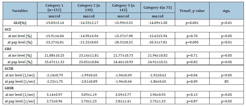 Figure 4:Graphical illustration of the trend analysis of MLVSP across cardiovascular risk categories 1-4, highlighting the progressive decline in GLS and GCS at pap level with increasing risk burden.