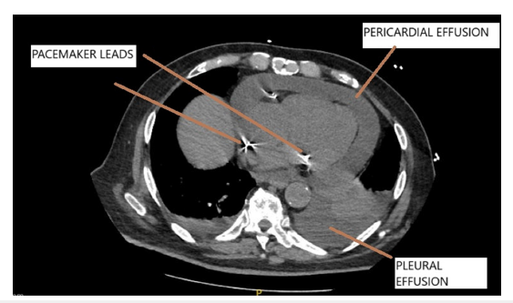 Figure 1:CT chest shows pericardial and bilateral pleural effusion. Pacemaker leads are also seen.