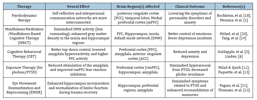 Neuroimaging research conducted approximately over the last 20 years has produced strong proof that psychotherapy alters the structure and function of the brain in measurable manners. An amazing principle was found where these outcomes suggest that certain brain circuits connected with memory, emotion control, and cognition are impacted by psychotherapy therapies. Crucially, there is a correlation between these brain alterations and clinical outcomes, demonstrating that psychotherapy is a physiologically proactive therapy rather than just a psychological one [6,8]. A table of brief clinical evidences of psychotherapies those have positive outcome for different brain diseases in Table 1.