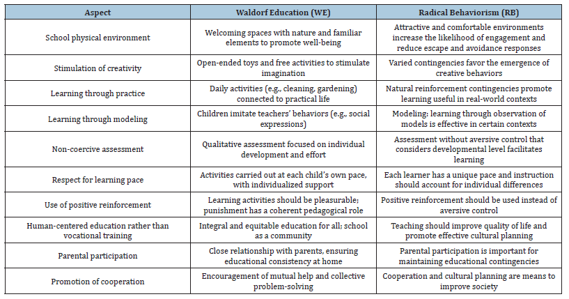 The physical structure of Waldorf schools is designed to foster harmony and integration in children’s development, aligning with the pedagogical goal of using architecture and outdoor spaces as integral parts of the learning environment. In line with this, these schools are typically situated in welcoming and serene buildings and include natural outdoor elements such as gardens, trees, and play areas, creating an atmosphere of well-being and familiarity for students. This approach reflects the school’s intention to make the natural environment a living classroom and to promote a sustainable and aesthetically conscious setting for education [45]. Similarly, from the perspective of RB, the physical structure of any environment affects human behavior. An attractive, comfortable, and colorful room reinforces behaviors such as entering and remaining in the space, whereas an uncomfortable and visibly unpleasant environment may elicit emotional responses (e.g., anxiety), leading to avoidance or escape behaviors. Although the physical structure does not directly determine learning, a comfortable and appealing school environment increases the likelihood that students will feel motivated to remain at school [10-46]. Both approaches emphasize the importance of a welcoming environment as a facilitator of learning. Waldorf Pedagogy seeks to stimulate and develop creativity and imagination in students. For example, painting activities are always carried out on blank paper or boards and toys are generally handmade from wood or fabric, often without well-defined contours, in order to stimulate imagination and the emergence of new behaviors [47]. A novel or creative behavior emerges when, in a previously unexperienced situation, the organism emits a new response that may be reinforced and selected by its consequences. Artistic activities are also encouraged in Skinner’s Walden Two [42]. By proposing activities that are more independent and openended, WP provides contexts in which creative behaviors may emerge. In other words, the arrangement of varied contingencies favors the emission of creative behavior. Both approaches value experimentation, albeit from different theoretical foundations-WP emphasizing intrinsic imagination and Applied Behavior Analysis (ABA) focusing on behavioral shaping through reinforcement [19,43-48]. It is common in Waldorf schools for students to engage in daily practical activities, such as those mentioned above. From a behaviorist perspective, this practice benefits learning because it exposes students to natural contingencies of reinforcement-that is, behaviors are directly connected to the natural consequences they are likely to encounter in the future. Experiencing the outcomes of domestic activities, such as cleaning one’s environment, repairing furniture, or observing the growth of garden plants, exemplifies this process [9]. According to WP, during the first developmental stage (the first septennium), children’s speech patterns, gestures, and play behaviors are largely imitative, as they replicate behaviors they observe in their environment. For this reason, preschool teachers educate children primarily through example and environmental arrangement [23]. During in loco observations, it was noted that the teacher consistently used verbal expressions such as “thank you,” “please” and “excuse me,” which were subsequently imitated by the children, among many other behaviors. In alignment with WP, RB refers to learning through imitation as modeling. In certain contexts, organisms may learn more rapidly and efficiently through modeling than through other learning processes [17-34], which can be reached by the occasion of “a collegial basis for teachers working together as an important tool in shaping teachers’ values and beliefs” [48].