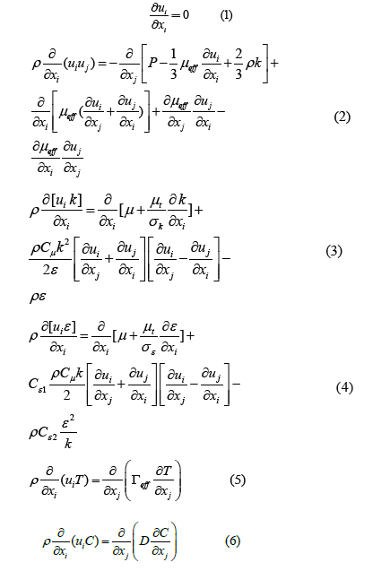 According to the mentioned references [21-26], the combination of genetic algorithm with image processing can be verified in solving computational fluid dynamics problems for phenomena that have thermo-hydrodynamic fields along with concentration fields in laminar and turbulent flow fields that may have heat and mass transfer. Also, in the Lagrangian approach, the tracking of particles in the flow field (such as nanoparticles or ions suspended in the fluid) can be simulated. The equations governing the flow field to simulate the stated physical phenomena are expressed as follows. Chien’s et al. [27] low Reynolds k-ε model [27,28], Launder et al. [29], Franke et al. [30], Kato et al. [31,32] and Boussinesq approximation [33] have been used to model this incompressible turbulent fluid flow. The steady-state governing equations for the fluid [27-33] and heat [34] flows have been illustrated as follows according to Einstein’s notation, which has been solved concurrently: