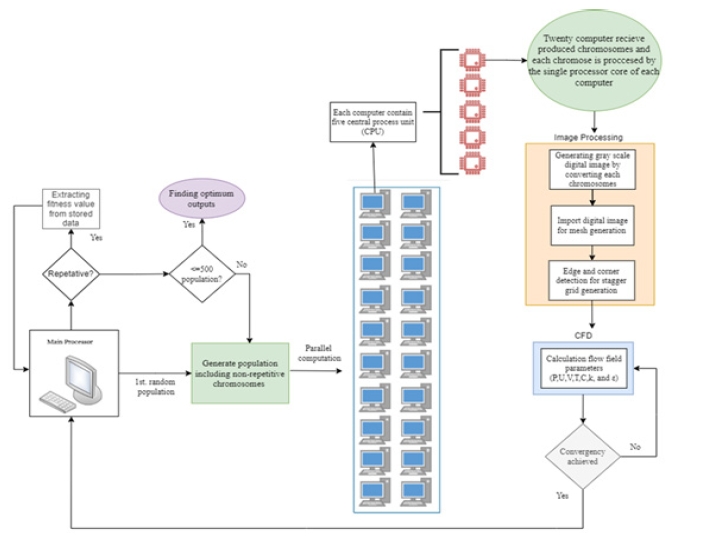 In this research, the modified genetic algorithm which has been developed by the author is combined with image processing and computational fluid dynamics for parallel processing. The developed algorithm has the possibility of simulating physical phenomena with mass and heat transfer in a laminar and turbulent flow. The image processing method has been used to produce the computational mesh. It is done by importing a digital photo in grayscale and converting it to a black-and-white photo with strong color contrast by the filters applied in the image processing method. This work leads to the identification of the edges of the object and the desired mesh is created in a movable way. Complete explanations along with the examination of image processing methods in various fluid dynamics problems are given in references [21-25]. Figure 1 shows the general flowchart of the existing steps until reaching the optimal solution. The main computer, which is responsible for controlling sub-computers in parallel processing, produces the first generation of inputs for the desired problem with the help of the genetic algorithm.