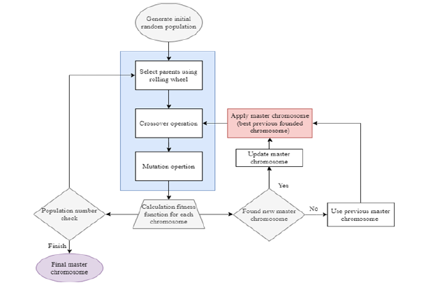 According to Figure 2, when the crossover step is applied, this chromosome is also involved. With the acquisition of new chromosomes, the objective function is investigated. If a new chromosome is obtained that is optimal compared to the master chromosome, that chromosome replaces the master chromosome and is used in the production of new generations. In the case of a normal genetic algorithm, this step does not exist and the number of random chromosomes created will be far from the desired optimal solution. This applied modification helps the obtained chromosomes to move faster than the optimization goal. Genetically, this type of mutation is seen in nature in cats. The author believes that according to the experiments, the described algorithm is much more efficient than the traditional genetic algorithms.