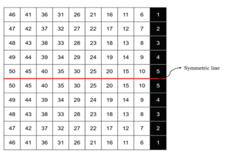 To check the effectiveness of the current research in parallel processing, we are investigating the optimization of a simple square to reduce the drag force. Figure 3 shows the number of pixels in a square. Each square is introduced as a gene in the genetic algorithm. It shows the total set of genes in the form of a chromosome. The right column in the figure shown in black is fixed and is considered a constraint applied by us in the genetic algorithm. For greater simplicity and time reduction in the implementation of the developed code, the symmetry condition is applied. Figure 3 shows the top view, therefore, the genes on one side of the symmetry line are used for simulation. In the genetic algorithm, each gene has a value of 0 or 1, which means that the desired pixel is on or off. This means that the blackness of each pixel means a solid body and the whiteness of a pixel means a flow field. Another condition that is considered in the genetic algorithm is the condition of continuity in the shape obtained from each chromosome. The central computer controls the output of each computer in the parallel processor. If the obtained shape does not have pixel continuity (for example, several genes are lighted in a scattered manner), it is not acceptable and will be removed. This condition helps significantly in removing extra chromosomes and reduces the execution time.
